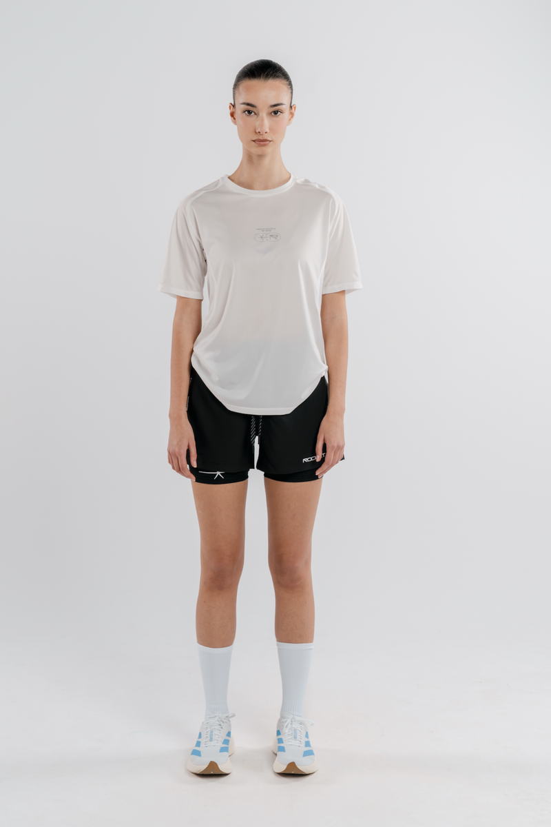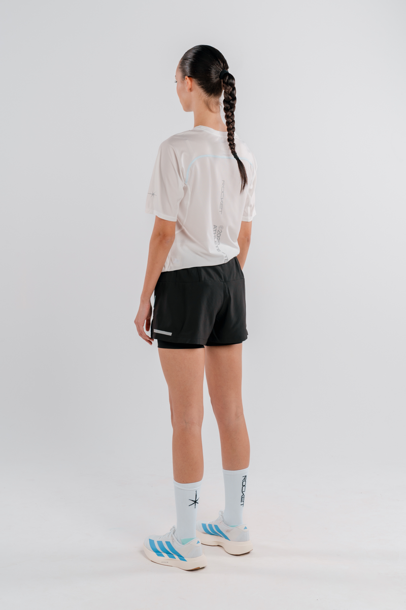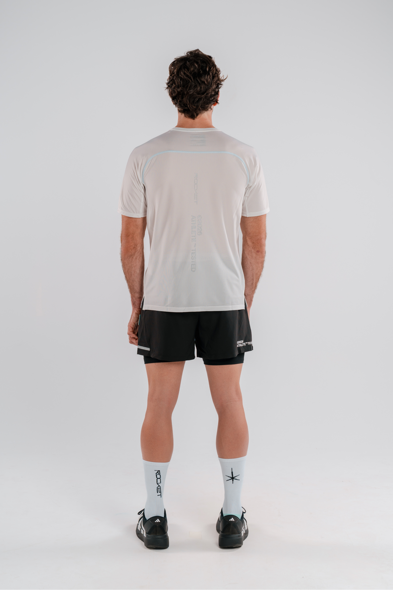 Screenprint blanco con branding de Rocket sobre un tejido ligero buscando la comodidad en cada entrenamiento. Malla interior que optimiza la comodidad y secado rápido a través de las perforaciones simétricas en el tejido.